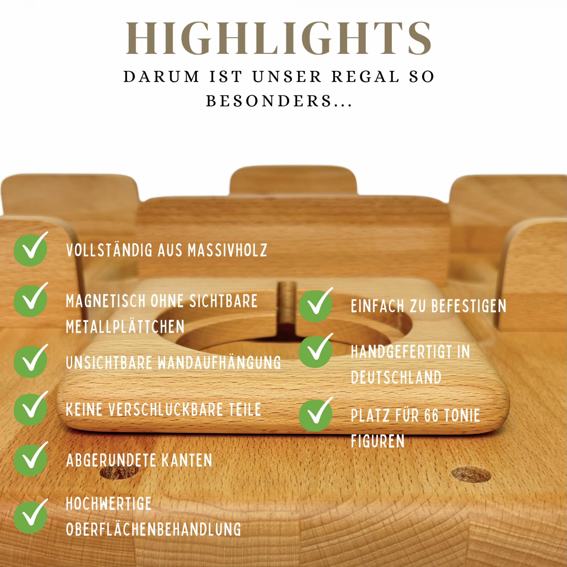 - Die Tableaus, auf denen die Tonie Figuren stehen, sind ebenfalls aus Massivholz Buche gefertigt und mit Dübeln an der Grundplatte verleimt