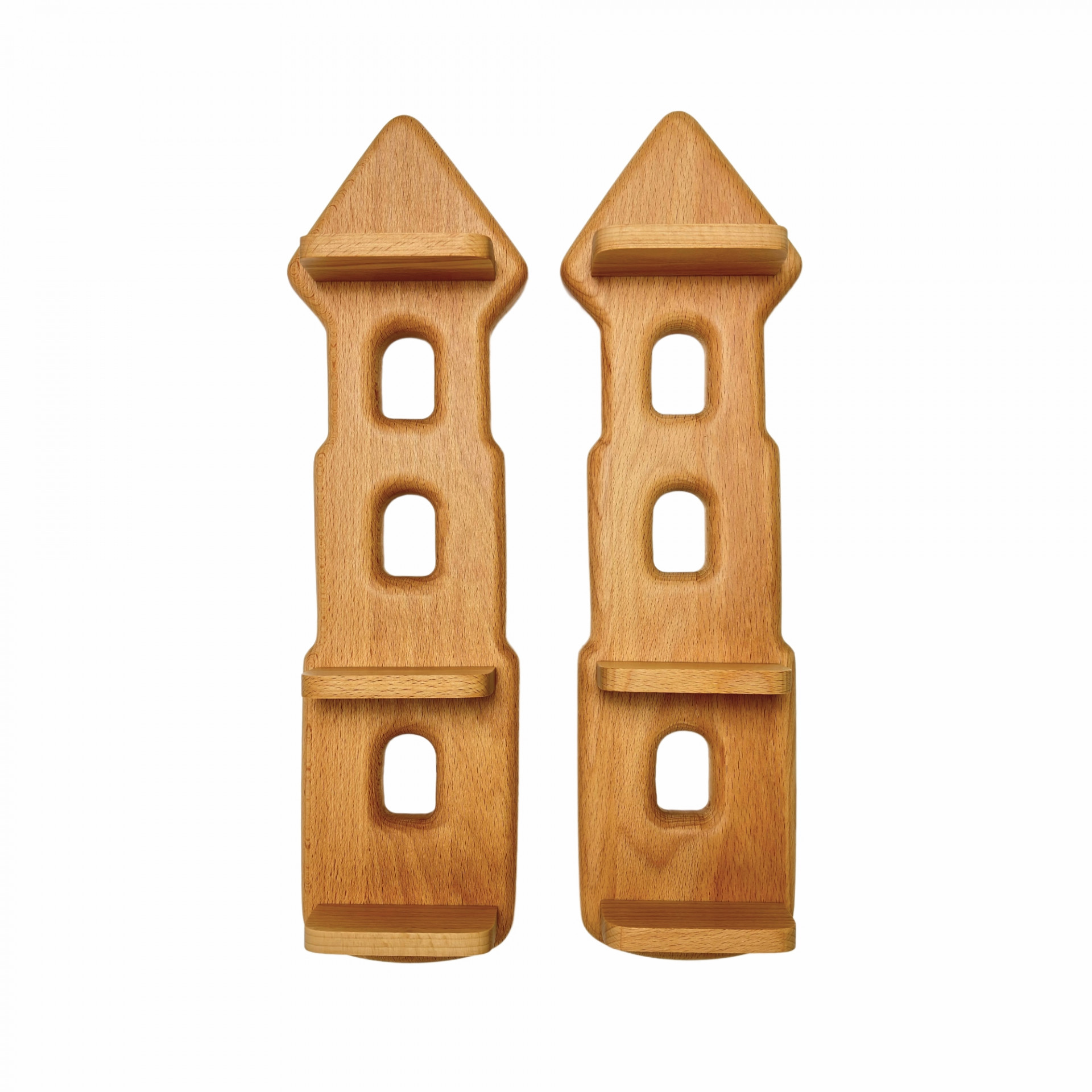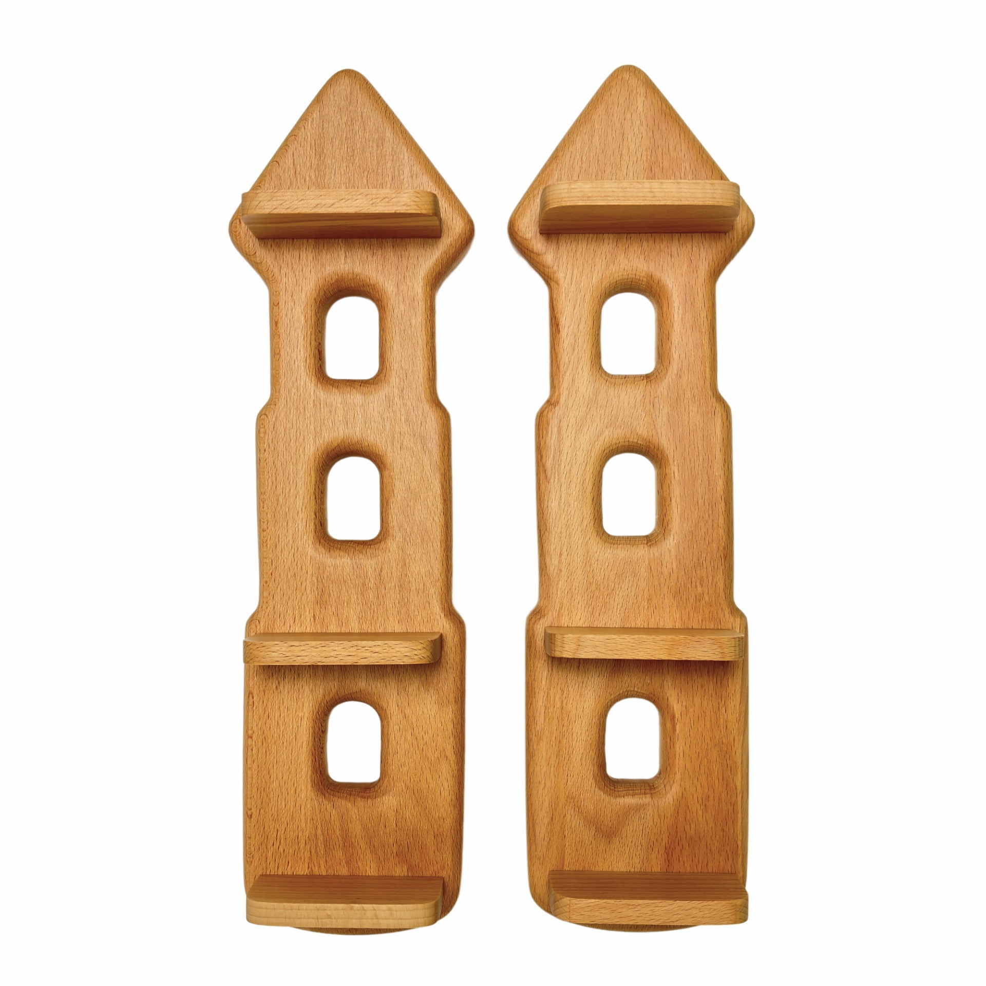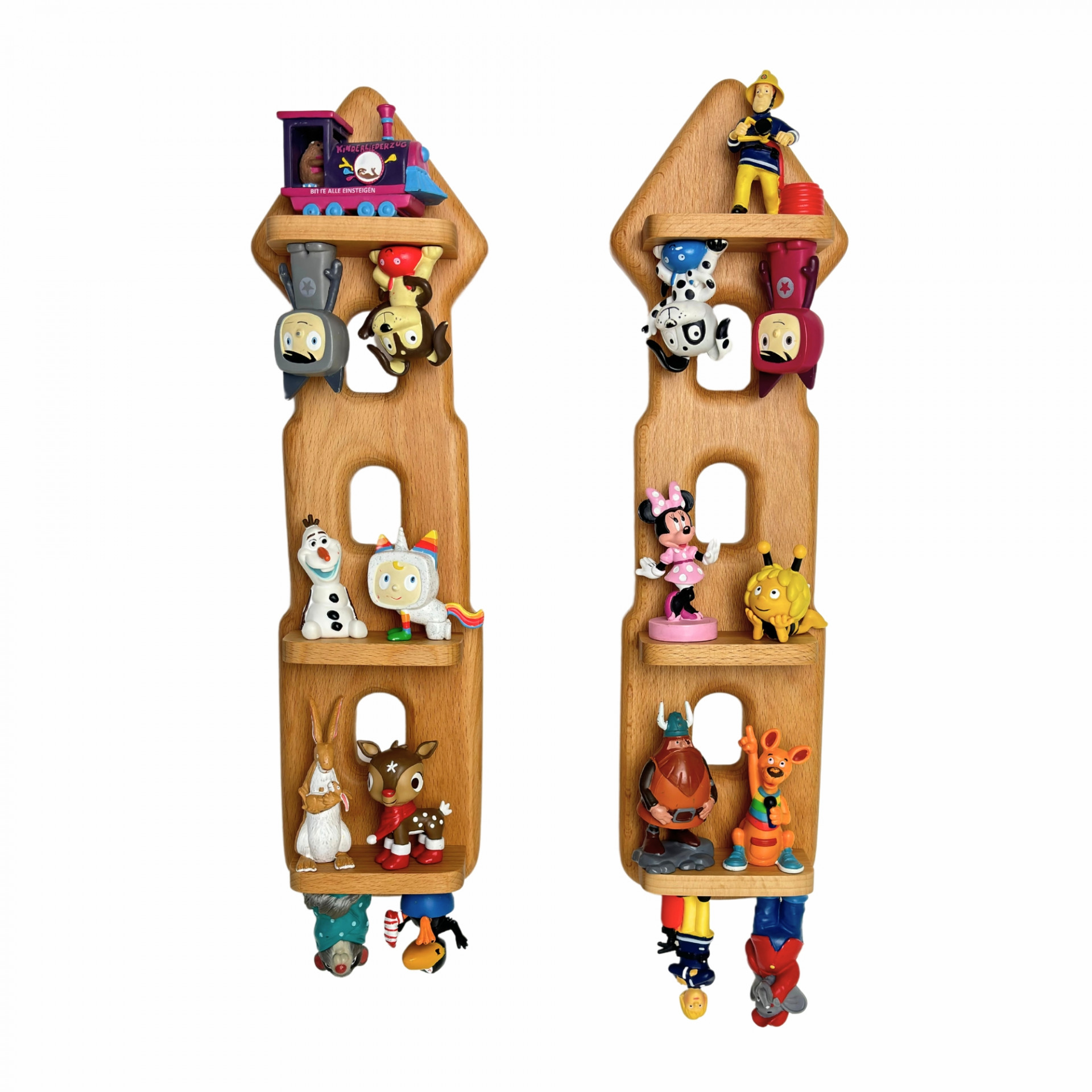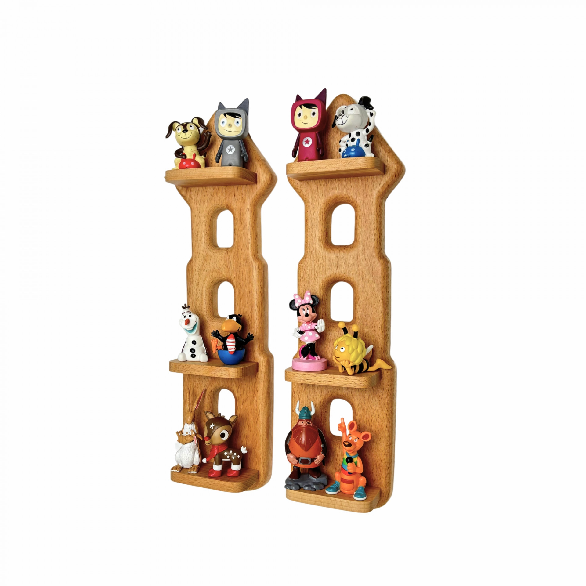 Handgemachtes Wandregal für Tonie Figuren aus Massivholz Buche, in der Form eines Schloss / Ritterburg mit magnetischen Regalträgern.