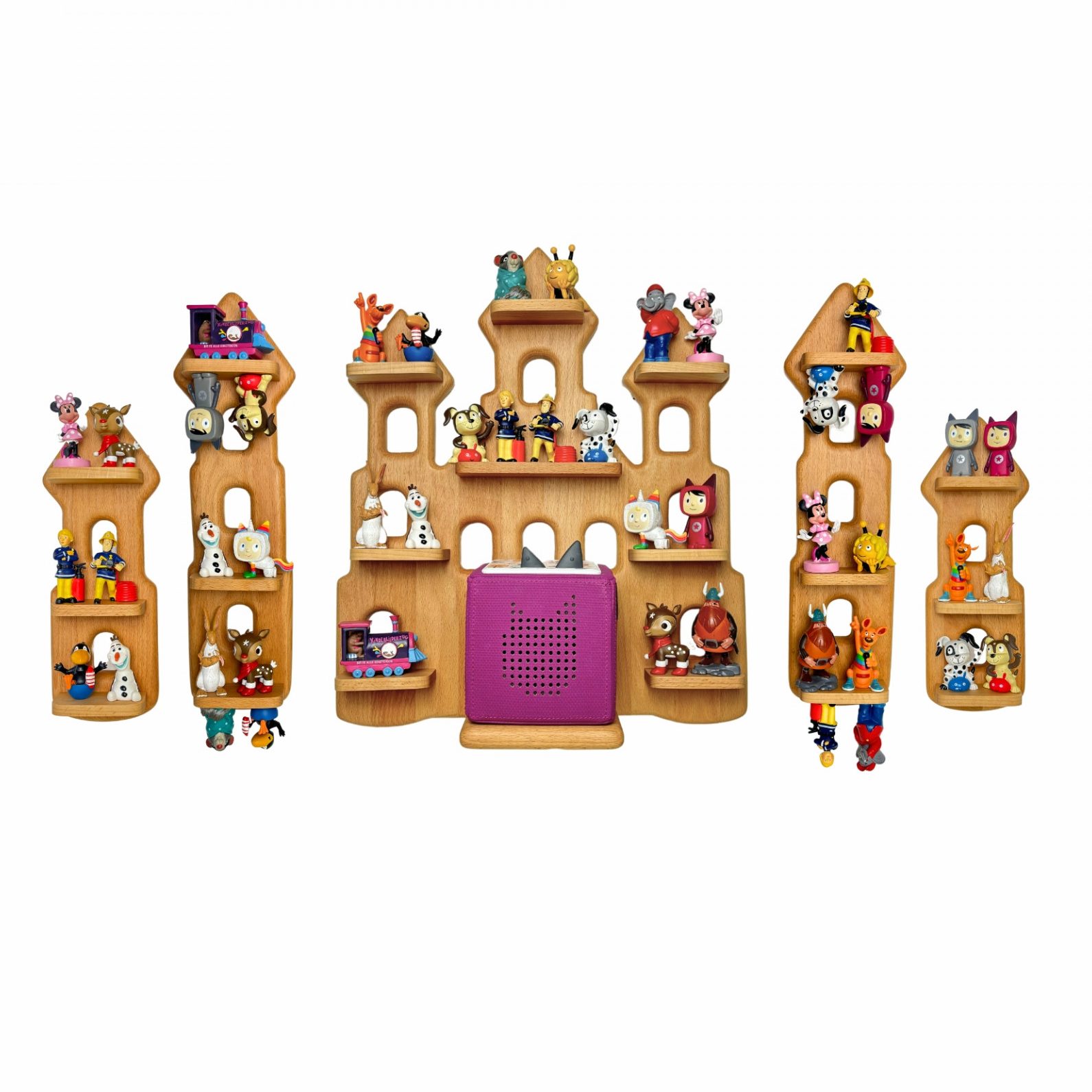 Unsere Regale für Tonie Figuren sind bei Bedarf erweiterbar, und wachsen mit der Figuren Sammlung deines Kindes. Für jedes Toniebox Regal stehen passende Regalerweiterungen und Kindergarderoben wie z.B. Wolken, Sterne, Monde, Türme, Zeppeline usw. zur Verfügung.